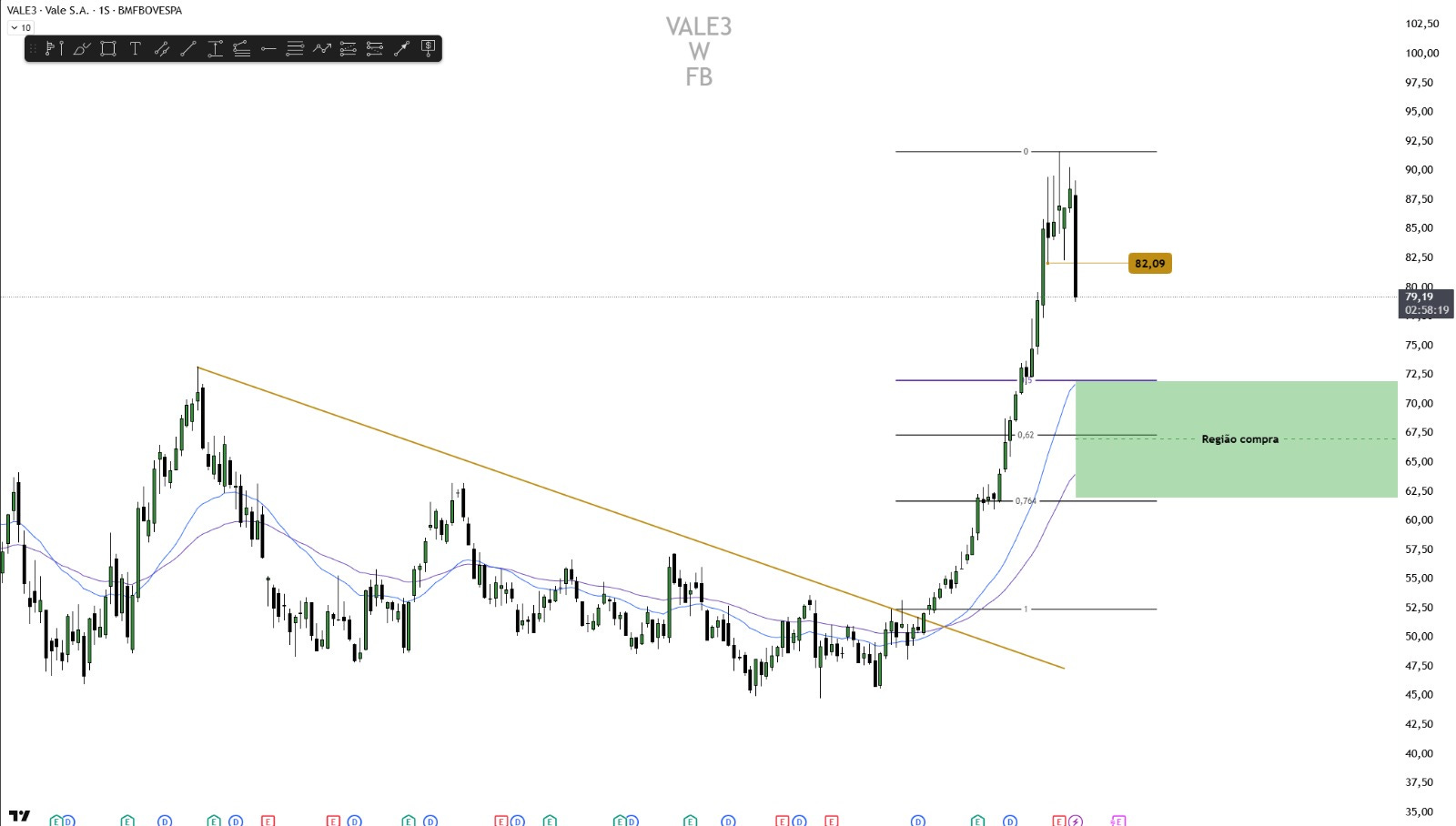 Entre os papéis de maior peso no índice, as ações da Vale ampliaram as perdas. O ativo rompeu o nível de R$ 82 nas últimas semanas e encerrou o período próximo de R$ 79. De acordo com Borges, o cenário técnico segue desfavorável no curto prazo. “A perda de R$ 82 confirmou a saída do ativo e abriu espaço para novas quedas”, diz. O analista avalia que a região entre R$ 71 e R$ 62 pode voltar a atrair compradores. “Entre R$ 62 e R$ 63 existe uma área de defesa importante dos compradores, que pode gerar novas oportunidades de compra”, afirma. Até lá, ele recomenda cautela com o papel.