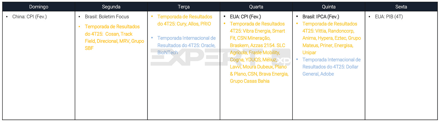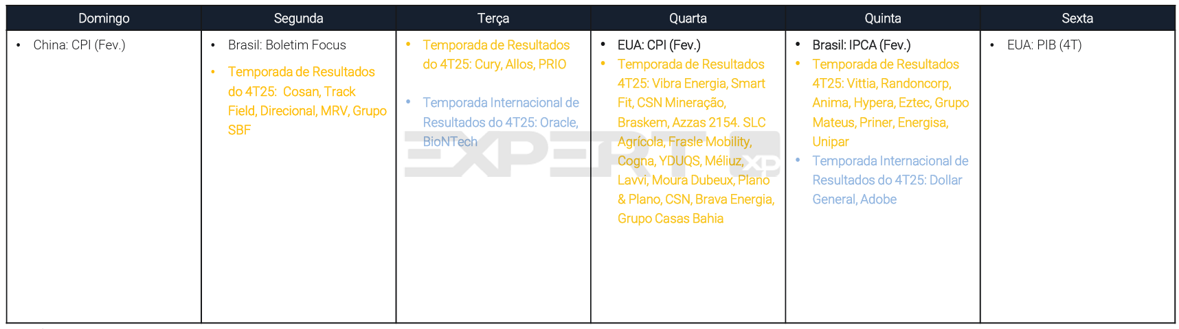 Paralelamente, a semana traz uma bateria relevante de indicadores econômicos. Nos EUA, serão divulgados o CPI de fevereiro (11) e o PCE — índice de inflação preferido do Fed —, além da segunda leitura do PIB do quarto trimestre (13). No Brasil, o IPCA de fevereiro (12) e os dados de varejo e serviços de janeiro ditarão o tom para a reunião do Copom de 17 e 18 de março, onde um corte de apenas 25 pontos-base na Selic — de 15% para 14,75% — ganha força. China e Japão também publicam dados relevantes de inflação, balança comercial e PIB.