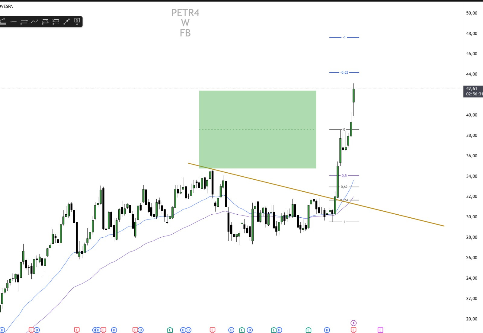 Já as ações da Petrobras acumulam forte valorização recente, impulsionadas pela alta do petróleo em meio às tensões no Oriente Médio. O risco de interrupções no fluxo de petróleo pelo Estreito de Ormuz, rota por onde passa cerca de 20% da produção mundial, sustentou a valorização do setor. Para Borges, o papel atingiu uma região importante de preço. “A ação chegou ao alvo técnico entre R$ 42 e R$ 42,50”, afirma. Diante disso, o analista recomenda cautela com novas posições. “Neste ponto, faz sentido realizar parte dos lucros e ajustar o stop abaixo da mínima do dia, em R$ 39,80, para proteger o ganho recente”, diz.