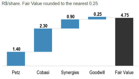 Na análise de soma das partes, o JP Morgan concluiu que os preços atuais incorporam, em grande parte, o valor das operações independentes de Petz e Cobasi, além do caixa a ser pago pela Cobasi. “As sinergias permanecem como upside”, afirma o banco. O relatório também destaca que, excluindo sinergias, a Cobasi passa a responder por uma fatia maior do valor da NewCo, impulsionada por melhorias relevantes de rentabilidade e menor alavancagem financeira.
