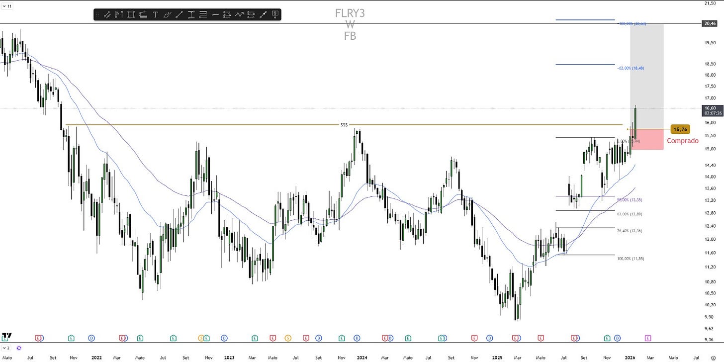 A Fleury apresentou o melhor fechamento semanal desde 2021, com rompimento técnico que acionou compra. A posição recomendada partiu de R$ 15,75 e já acumula ganho aproximado de 5%. Para Borges, o alvo projetado está em R$ 20,50, com ganho potencial de cerca de 30%. Parte da posição já foi realizada e o restante segue protegido no ponto de entrada, aguardando desdobramentos do mercado no curto prazo.