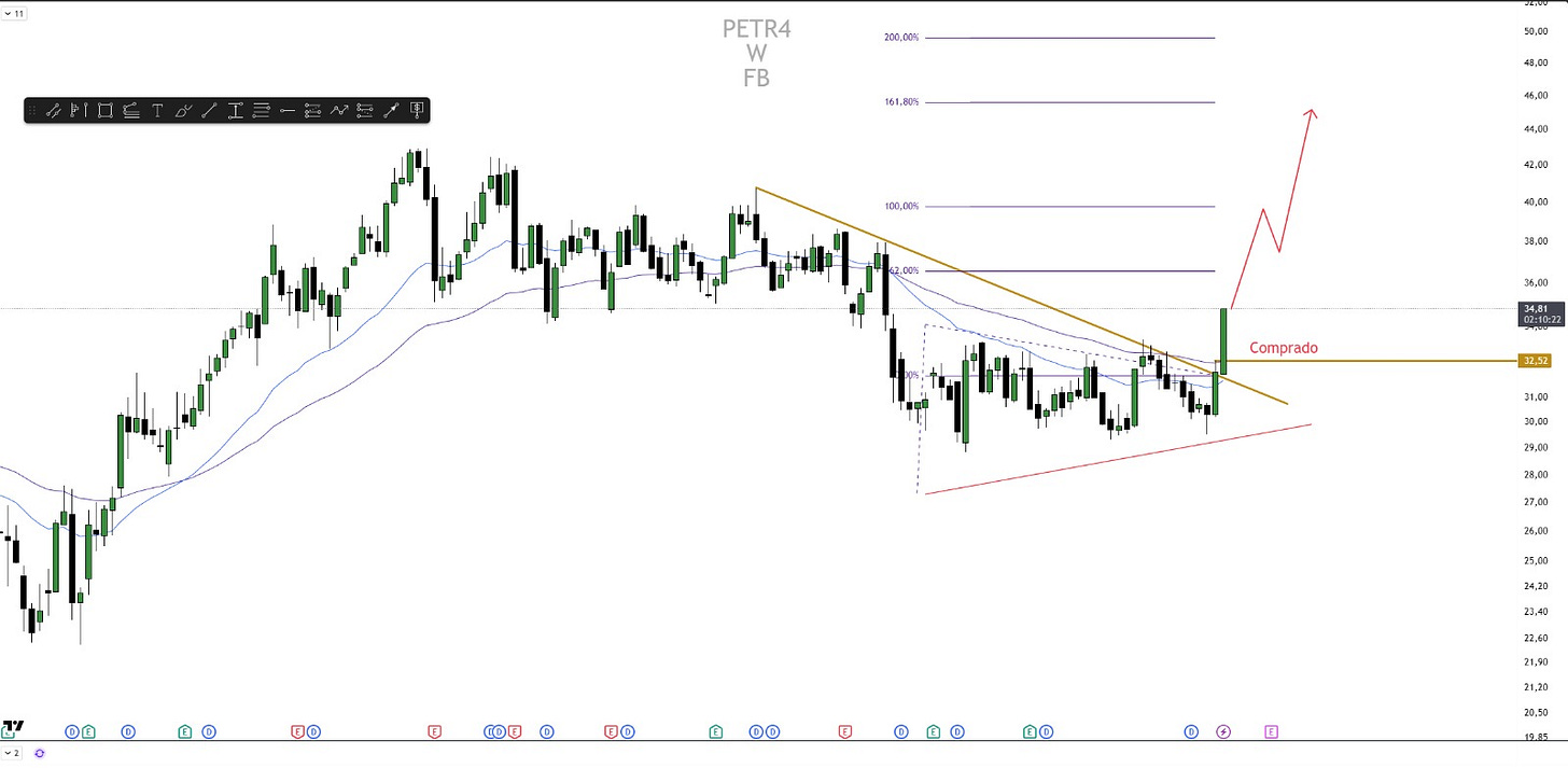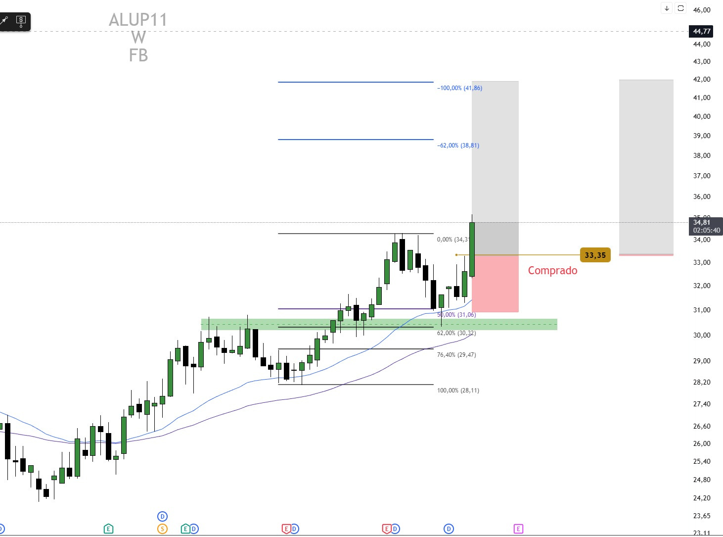 A Alupar também entrou no radar de compras com rompimento no gráfico semanal e confirmação de máximas históricas. Borges relata que a operação foi iniciada em R$ 33,35, com alvo técnico em R$ 41,95, o que implica potencial de valorização de aproximadamente 25%. O trade segue ativo com gerenciamento de risco em curso, alinhado ao cenário de continuidade da tendência de alta.
