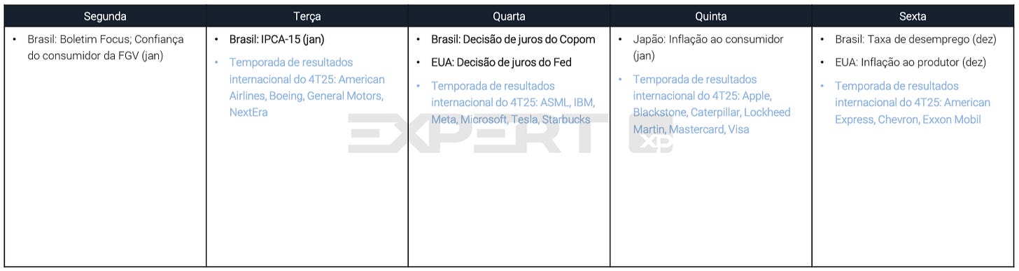 Nos Estados Unidos, o cenário é de espera. A inflação persistente próxima de 3% e o crescimento robusto do PIB (acima de 5% no 4º trimestre, segundo o Fed de Atlanta) sugerem que Jerome Powell pode encerrar seu mandato em maio sem novos cortes. A atenção se volta para a sucessão no comando do Fed, com o nome de Rick Rieder (BlackRock) ganhando força nos bastidores do governo Trump.