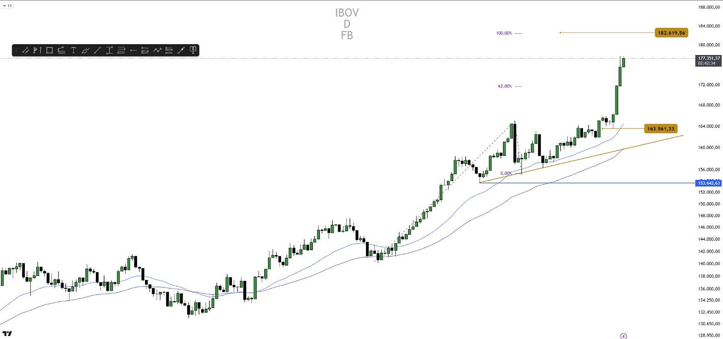 O Ibovespa encerrou a semana em forte valorização e ultrapassou as expectativas do mercado. Filipe Borges, analista técnico da NMS Research, explica que houve “entrada relevante de fluxo de capital” e que isso “refletiu diretamente na alta do índice”. A leitura técnica indica espaço para continuidade do movimento, com alvo na faixa dos 182.600 pontos. O suporte mais relevante está distante, na região dos 163.500 pontos, reforçado por uma linha de tendência de alta.