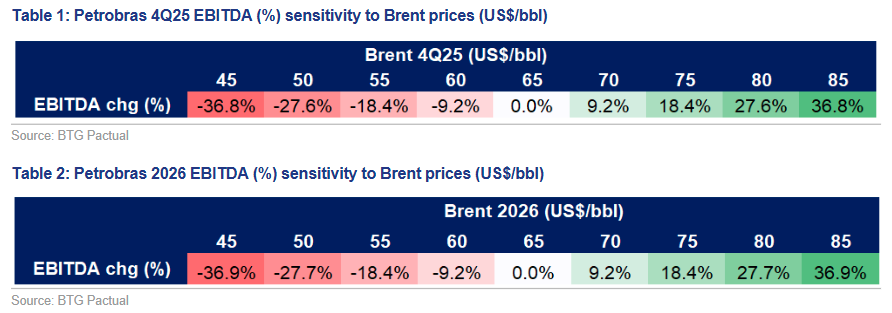 De acordo com o banco, a Petrobras [PETR4] evita recorrer a instrumentos tradicionais de hedge de petróleo, já que o tamanho da companhia torna essas operações custosas. O modelo integrado de exploração e refino oferece uma proteção natural contra oscilações do preço do barril, enquanto o foco principal da estatal permanece na cobertura cambial. Além disso, o portfólio de produção de longo ciclo e já sancionado faz com que a empresa priorize a resiliência do balanço em detrimento de proteções de curto prazo.