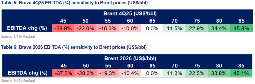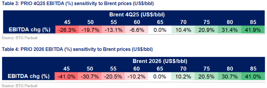 A Prio [PRIO3], segundo o BTG, possui atualmente cerca de 1,8 milhão de barris protegidos para outubro e outros 1,8 milhão para novembro de 2025, com preço médio de aproximadamente US$ 65 por barril. A expectativa é que a companhia detalhe novos desdobramentos de sua estratégia de hedge para 2026 na divulgação dos resultados do terceiro trimestre deste ano.