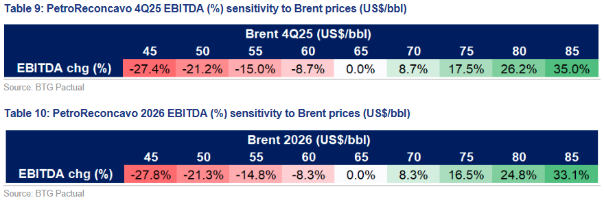 Entre as companhias sob cobertura do BTG, a PetroRecôncavo [RECV3] é a que apresenta maior nível de proteção contra oscilações do petróleo. O relatório indica que cerca de 50% da produção total da empresa está atualmente coberta, sendo 88% do gás natural protegido por contratos de preço fixo ou mínimo (atrelados ao Brent a aproximadamente US$ 70,7 por barril)— e 25% da produção de petróleo travada em US$ 65/bbl para o 3º trimestre de 2025 e US$ 60/bbl para o 4º trimestre. Para 2026, cerca de 20% da produção de óleo já está protegida a US$ 60 por barril.