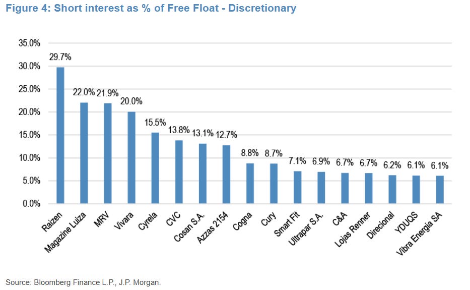No setor de Consumo Discricionário, o short interest é notavelmente alto, com algumas ações ultrapassando 20% do free float: