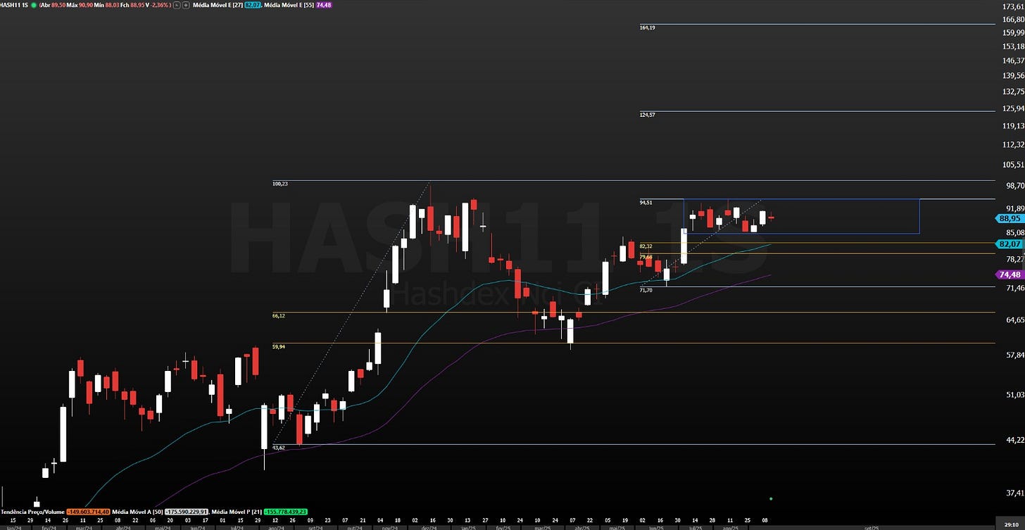 O ETF Hashdex Nasdaq, que replica um portfólio de criptoativos, segue consolidado no gráfico semanal, mas mantém tendência de alta no longo prazo. O rompimento de R$ 94,50 abre espaço para buscar R$ 125,30, alvo que representa potencial de valorização de 30%. Borges ressalta que o desempenho do fundo está diretamente ligado ao comportamento de Bitcoin e Ethereum, que juntos compõem 95% da carteira. “O Bitcoin ainda tem espaço de alta, mas o Ethereum pode apresentar um potencial maior e puxar a valorização do fundo”, disse o analista.