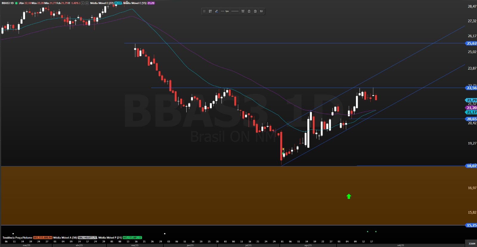 As ações do Banco do Brasil encontram barreira técnica em R$ 22,56, o que limita o espaço para novas altas. Borges avalia que, enquanto o papel não superar esse nível, não há gatilho de compra no curto prazo. Ele destacou ainda que a perda do suporte em R$ 20,65 pode abrir espaço para queda até R$ 18,00, mínima registrada em agosto. Segundo o analista, o próximo balanço será decisivo para uma visão mais clara sobre o ativo.