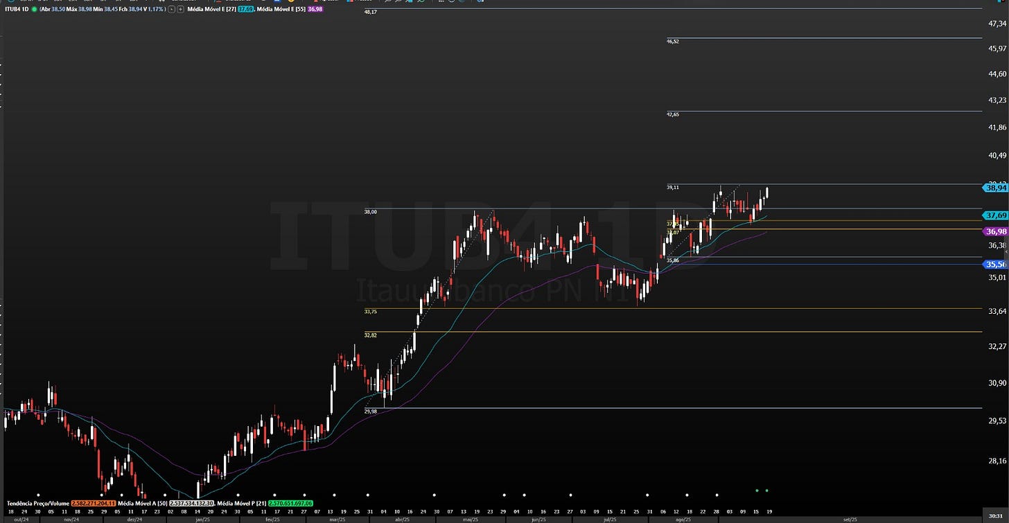 Já o Itaú mantém trajetória positiva e confirmou pivô de alta após o rompimento de R$ 39,10. O cenário técnico projeta valorização de até 9,3%, com alvo em R$ 42,65. Caso esse patamar seja superado, a ação pode avançar até R$ 46,52, o que representaria upside de cerca de 20%. Para Borges, o alinhamento entre os gráficos diário e semanal reforça o fluxo comprador no ativo. O stop estratégico está posicionado abaixo de R$ 37,00.