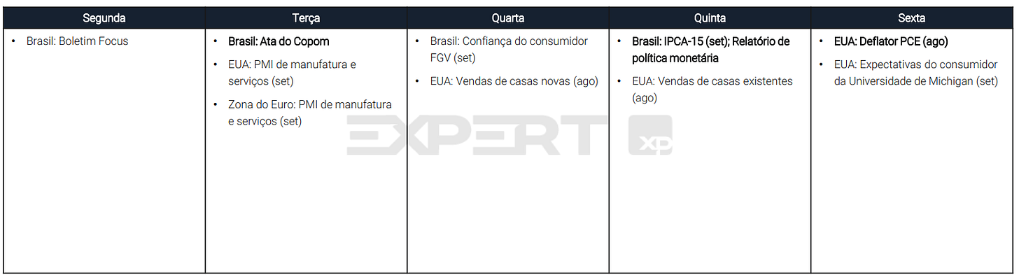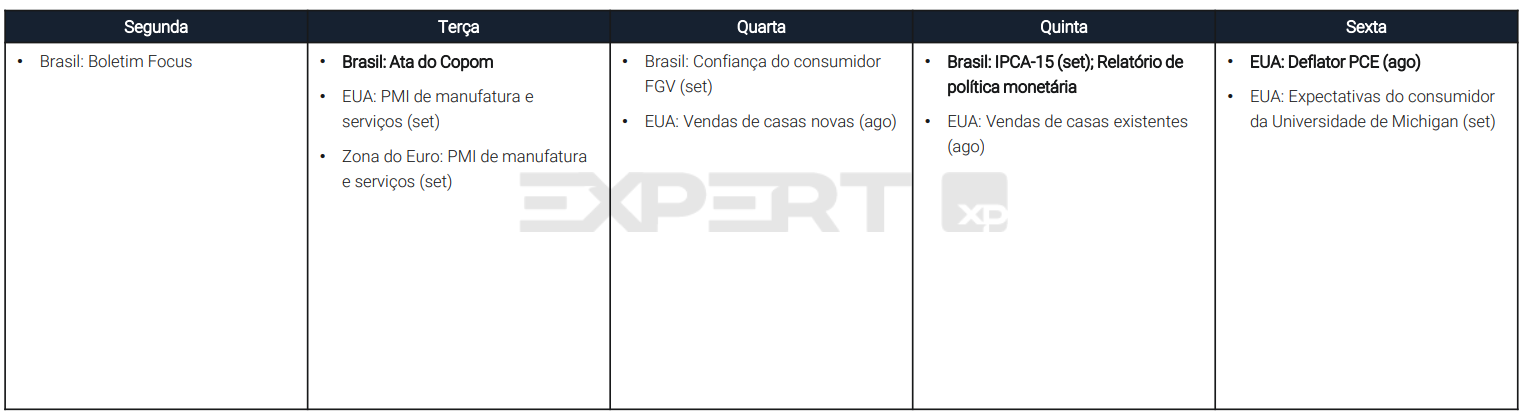 O dado de PIB deve confirmar crescimento robusto, mas há um ponto de atenção. Boa parte da alta foi explicada pela queda das importações, o que mascara a perda de fôlego do consumo. Na sexta, o PCE de agosto dará a real dimensão da pressão inflacionária e do impacto das tarifas de Trump.