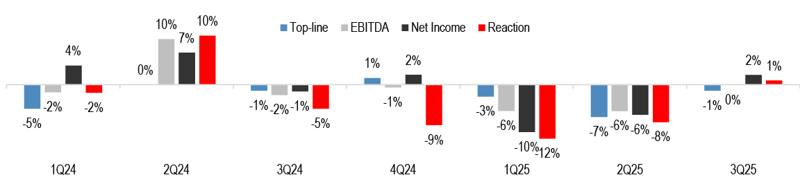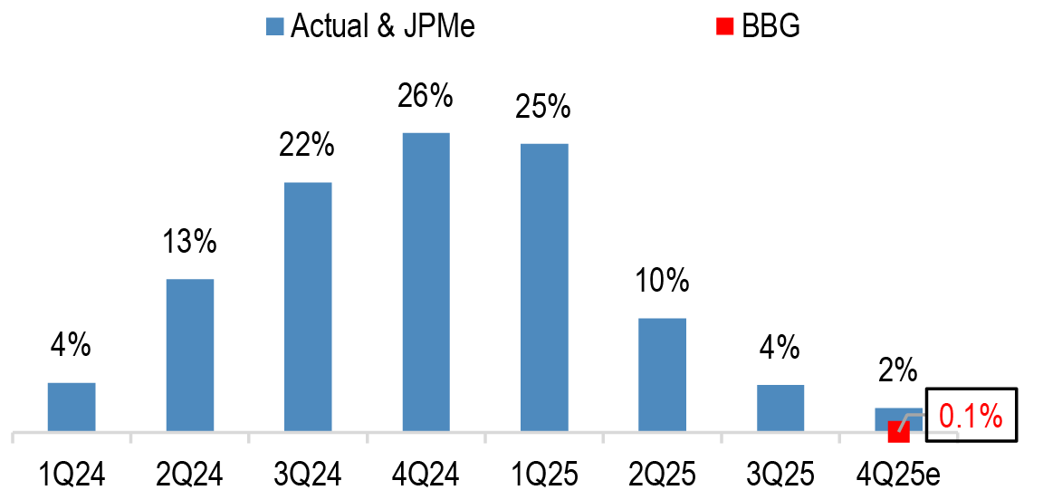 A instituição projeta um quarto trimestre fraco, com crescimento de receita de cerca de 2% na comparação anual e margens pressionadas. Embora parte do mercado já espere um desempenho mais fraco no período, o banco acredita que a confirmação de números modestos pode levar a revisões negativas nas estimativas para 2026.