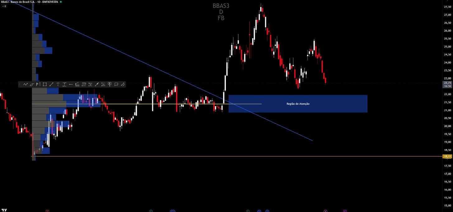 As ações do Banco do Brasil operam em uma região que ainda não apresenta sinal claro de entrada, na avaliação do analista. O papel gira próximo de R$ 22,72, mas a maior concentração de volume está entre R$ 21 e R$ 22. “Graficamente, não vejo uma boa oportunidade de compra nesse patamar atual, pois ainda falta uma mudança de comportamento nos tempos gráficos menores”, diz Borges. Ele explica que uma eventual entrada exigiria confirmação de tendência de alta em gráficos intradiários. “Antes disso, o ativo pode buscar liquidez em fundos anteriores na região de R$ 20,80 a R$ 20,90”, acrescenta. O analista afirma que só consideraria compra após essa confirmação, com alvo projetado em torno de R$ 27,50.