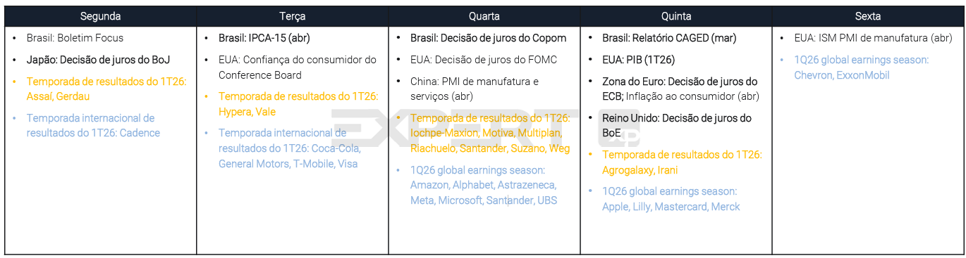 A próxima semana será marcada por decisões de juros nas principais economias, com expectativa de manutenção das taxas no exterior e novo corte no Brasil. O ambiente segue pressionado pelo conflito no Oriente Médio, que mantém o petróleo em alta e amplia incertezas sobre inflação e crescimento global.