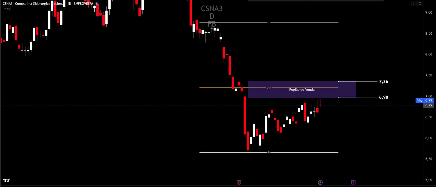Entre as ações, a CSNA3 aparece como uma das principais apostas de venda. O papel segue em tendência de baixa, com repiques técnicos limitados. “O ativo mantém um fluxo vendedor forte e as altas recentes indicam apenas correções”, afirmou Borges. Ele aponta uma faixa entre R$ 6,98 e R$ 7,35 como possível ponto de entrada para operações vendidas. “Vejo espaço para a ação recuar até R$ 5,60 e, se perder esse suporte, o movimento de queda pode se intensificar, com alvos entre R$ 3,50 e R$ 2,50”, disse.