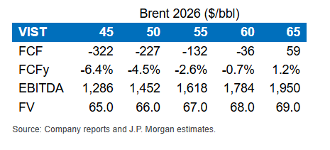 No cenário base, o JP Morgan projeta um FCF neutro para 2026. Com Brent a US$ 55, o fluxo de caixa livre ficaria levemente negativo, em -2,6%, ainda assim um desempenho melhor que o de produtores mais intensivos em capital.