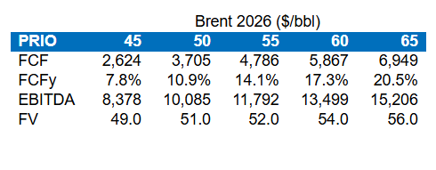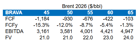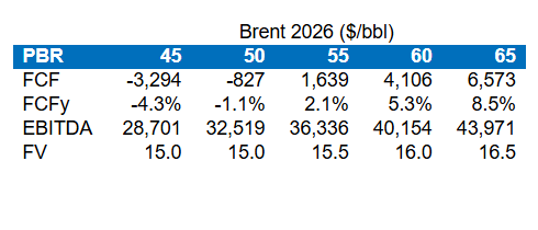 No cenário base, o banco projeta um FCF negativo de -6,3% em 2026, que se aprofunda para -8,7% caso o Brent fique em US$ 55.